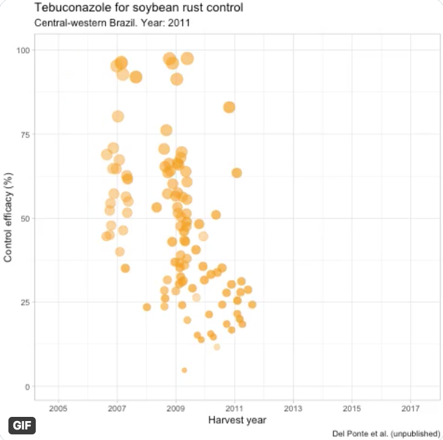 I recently Tweeted an animated GIF that depicted the yearly variation in efficacy of tebuconazole, a DMI fungicide, evaluated in field trials, for the control of soybean rust in a major soybean region of Brazil (Mato Grosso state). The Tweet got a lot of attention, not only because of the important issue, but I think also because of the nice way to visualize the data. So I decided to share the R code use to produce the animation for others' presentations.